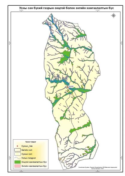 Аймгийн Засаг даргын 2023 оны 03 сарын 03-ны өдрийн А/116 тоот захирамжаар байгуулагдсан ажлын хэсгээс “Усны сан бүхий газар, усны эх үүсвэрийн онцгой болон энгийн хамгаалалтын, эрүүл ахуйн бүсийн дэглэмийг мөрдөх” журмын дагуу аймгийн хэмжээнд усны сан бүхий газрын онцгой болон энгийн хамгаалалтын бүс, сумын төвийн ус хангамжийн эх үүсвэрийн эрүүл ахуйн бүсийн хил заагийг шинэчлэн тогтоон баталгаажуулах ажил хийгдэж байна. Тус сумын хэмжээнд нийт 271 гол горхи, нуур тойром, булаг шанд, рашааны онцгой болон энгийн хамгаалалтын, сумын ус хангамжийн эх үүсвэрийн эрүүл ахуйн бүсийн хил заагийг Онон Улзын сав газраас тогтоон, суурин судалгааны ажил хийгдсэн бөгөөд, орон нутгаас санал авах, хээрийн хэмжилт, тодруулалтын ажил хийгдлээ.
