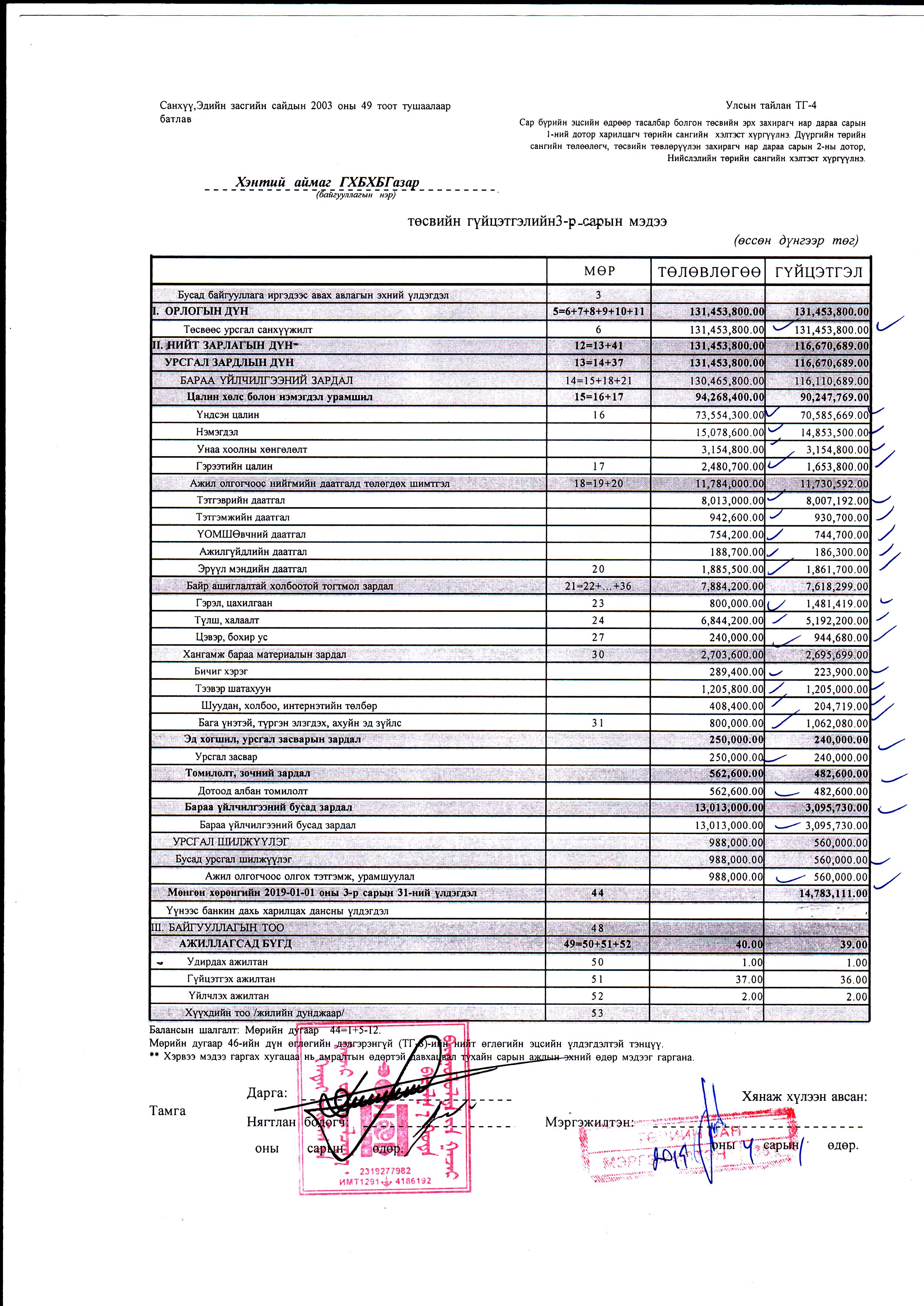 2019 оны 3-р сарын гүйцэтгэлийн мэдээ
