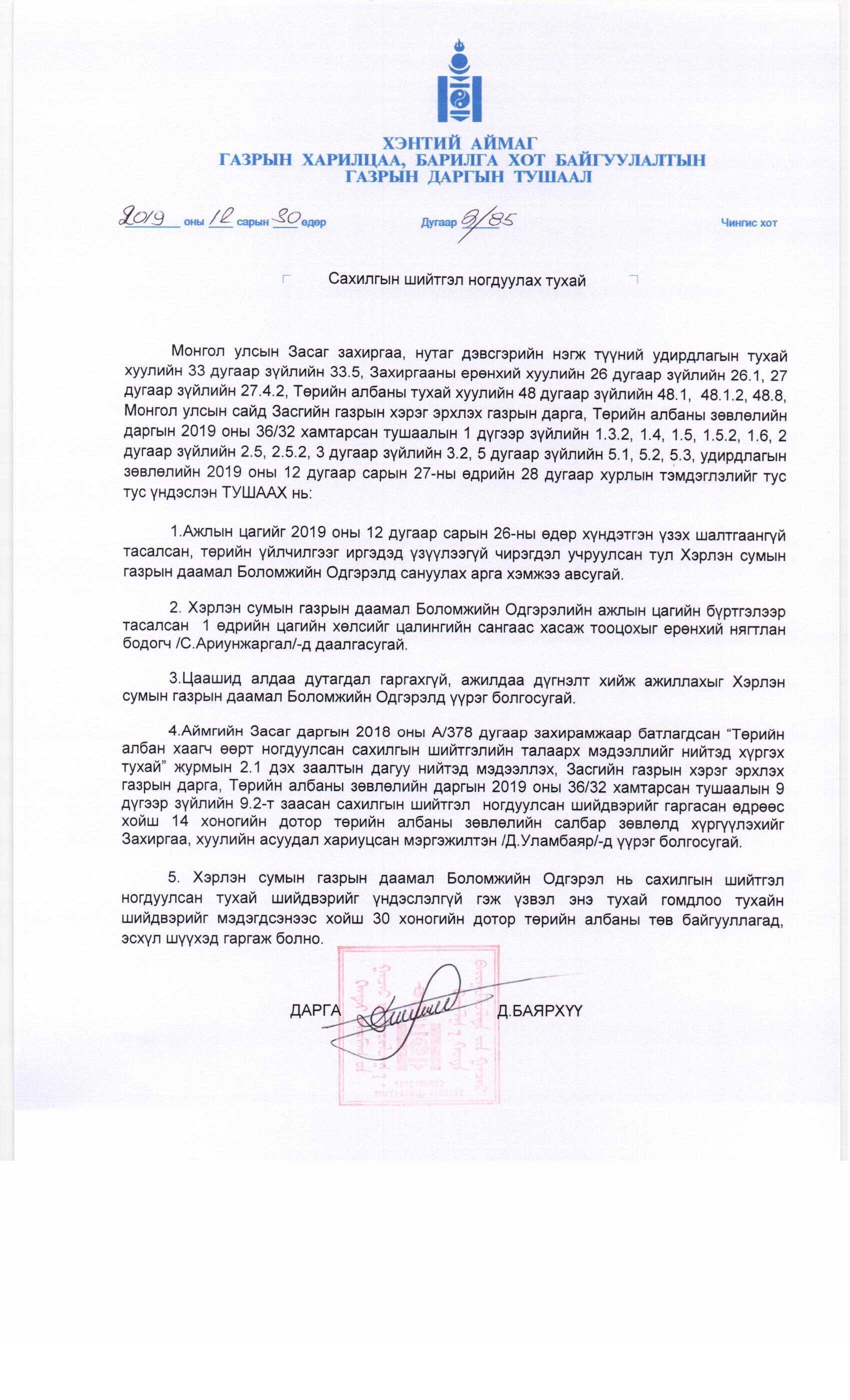 САХИЛГЫН ШИЙТГЭЛ НООГДУУЛАХ ТУХАЙ Б/85 ТУШААЛ