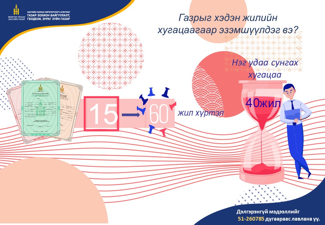“Газрын тухай” хуулийн 30.1-т “Газрыг Монгол Улсын иргэн, аж ахуйн нэгж, байгууллагад 15-60 жил хүртэл хугацаатайгаар эзэмшүүлж болно. Газар эзэмших эрхийн гэрчилгээг нэг удаад сунгах хугацаа 40 жилээс илүүгүй байна” гэж заасан байдаг.